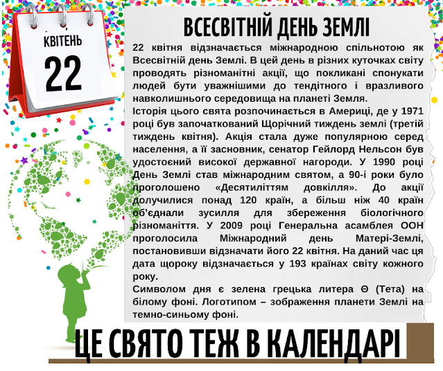 В цей день кожен житель планети може внести свій маленький вклад у справу захисту та відновлення довкілля: очистити від сміття берег улюбленої річки, посадити дерево, хоча б на один день відмовитись від користування автотранспортом. Земля – це величезний дар, ресурси якого буде неможливо використовувати вічно. Ми не зможемо врятувати планету згадуючи про неї лише один день на рік – цього явно недостатньо. Саме тому слід піклуватися про оточуюче нас середовище протягом всього року. Здавалося б, яка дрібниця в масштабах Планети – вимкнути за собою світло в кімнаті, здати макулатуру на переробку чи пройтися пішки до роботи, та саме з таких дій складаються великі справи! Уявіть – тисяча людей посадила по одному дереву – ось Вам і ліс! Мільйон людей закрутили кран, коли чистили зуби – річку врятували від пересихання. Мільярд людей вимкнули світло, виходячи з кімнати – одна ТЕС не потрібна. Саме такі справи, саме такі дрібниці допомагають нам врятувати природу Землі, зберегти добробут нашого великого спільного Дому.
